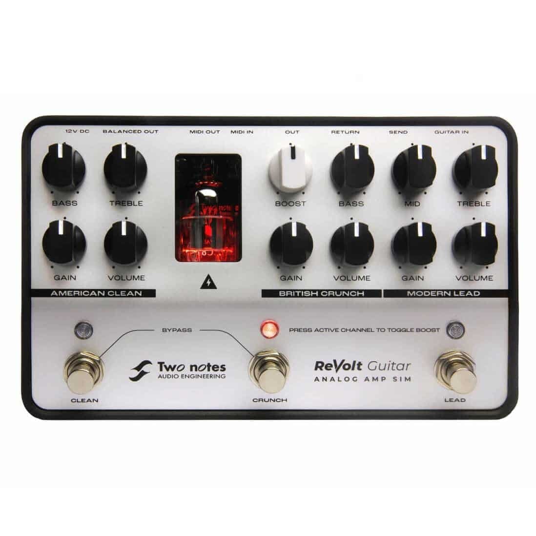 Three Channels of Iconic All-analog Amp Tones The Two Notes ReVolt Guitar is a 3-channel amplifier simulator with an all-analog signal path, complete with a 12AX7 preamp tube — run at a healthy 200V — for added warmth and bite. The ReVolt Guitar’s three channels deliver the full gamut of tones, from high-headroom cleans to hard-rock crunch to searing high-gain leads. You also get an integrated OD-Boost circuit to bolster your spotlight-stealing solos. An analog speaker simulation ensures a polished, miked-cab sound, both onstage and in the studio. Integrating the ReVolt Guitar with the rest of your rig is a cinch, thanks to a 4-cable mode, an FX loop, and MIDI I/O. This guitar preamp pedal also includes a collection of ten DynIRs for situations where you need more DI flexibility. Guitarists searching for a robust, made-to-move solution for their pedalboards and fly rigs will get tons of mileage out