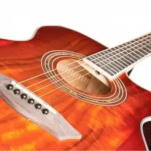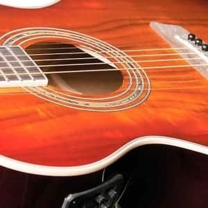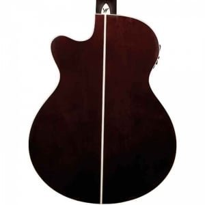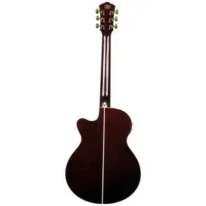 The Washburn Festival Series EA55G-A acoustic-electric guitar has a cutaway body made of catalpa with a laminated koa top.