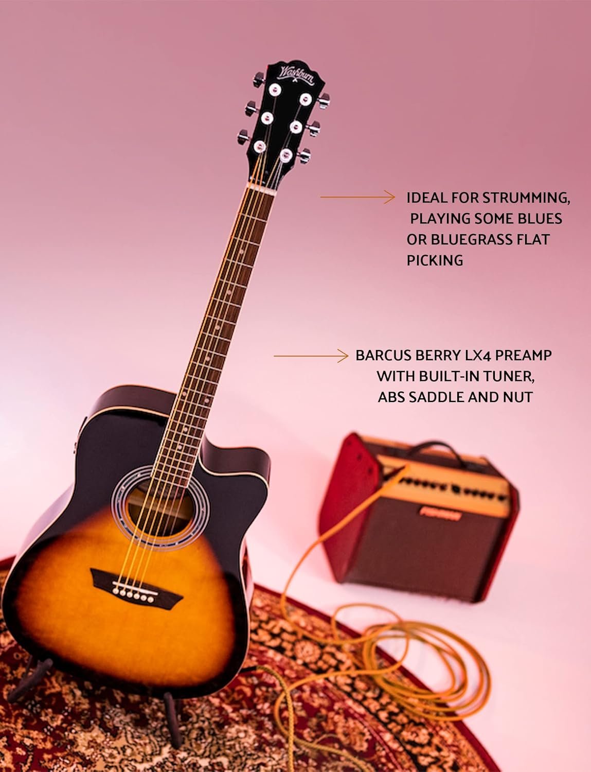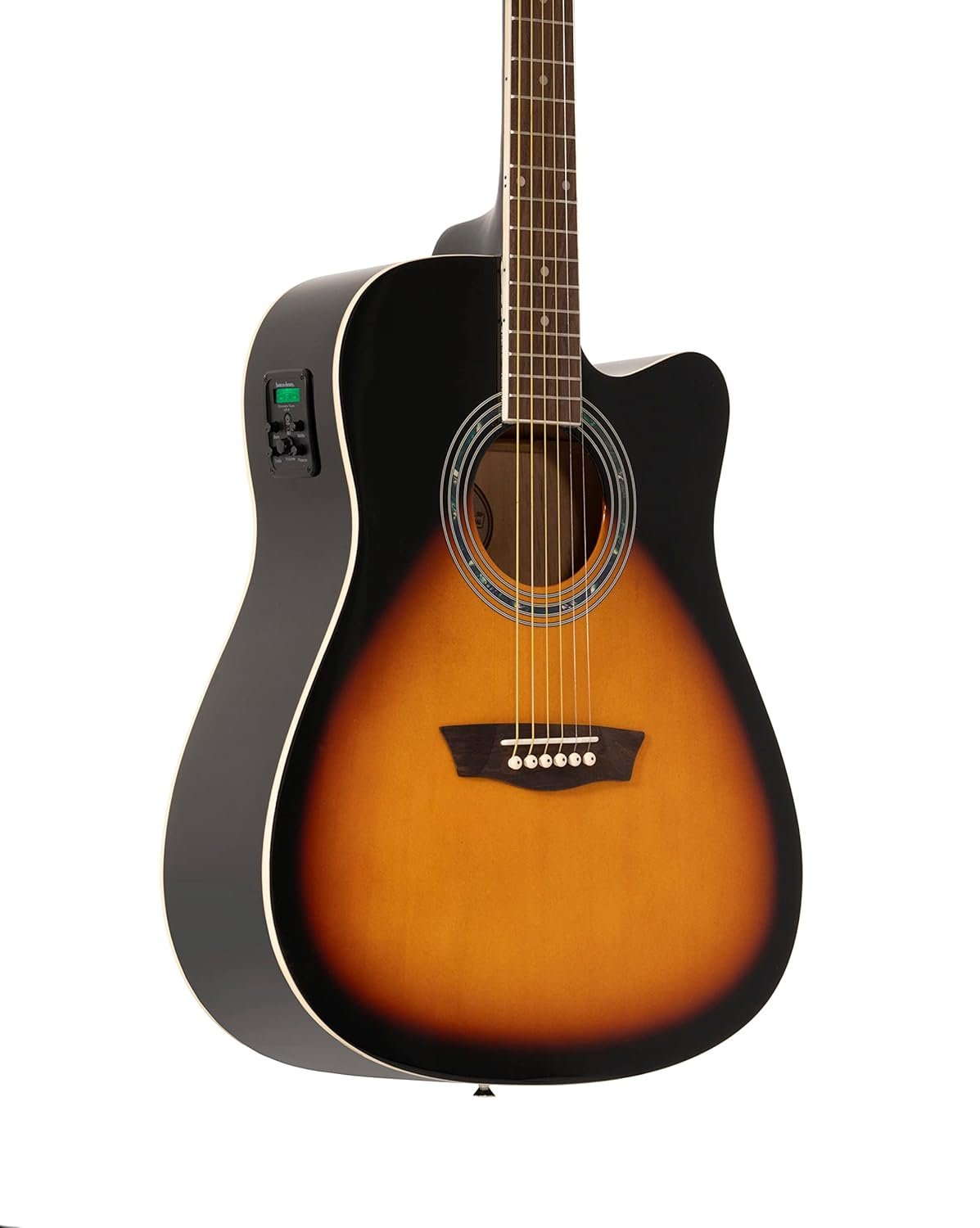 The Washburn WA90CEVSB-U is a stunning acoustic-electric guitar that is part of the Washburn Vintage Series, designed for musicians looking for a versatile instrument that delivers both quality sound and aesthetic appeal. This dreadnought-style guitar offers a remarkable combination of traditional craftsmanship and modern features, making it an excellent choice for players of all levels, from beginners to experienced performers.