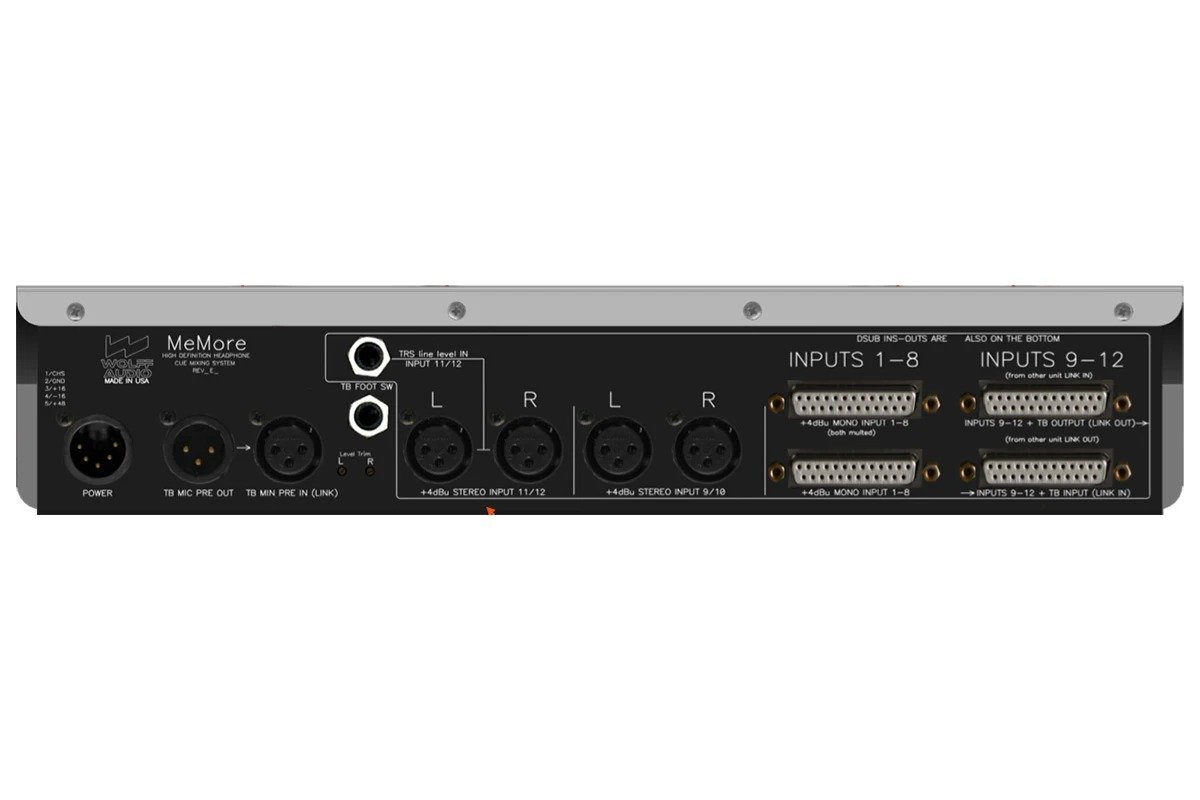 The Wolff Audio MeMore is a personal monitor mixer designed to provide an artist with complete, intuitive control of individual mixes. The absolute requirement: get a mix, always stay focused and in the groove. MeMore has no menus and no screens. Everything is on the front panel to be twisted or pushed – simple, intuitive and instant. 12 input channels: 8 Mono inputs and 2 Stereo for comprehensive channel count. 2 headphone amps with separate volume controls and they are LOUD! Built-in “HearMe” mic is used for the talkback channel and unique room mic foldback into the mix.